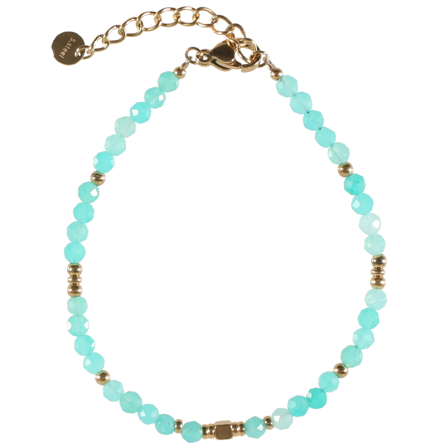Description Bracelet composé de perles en véritable pierre d'amazonite et de perles en acier doré. Fermoir mousqueton avec 3 cm de rallonge. Cliquez sur une matière, un thème, une couleur ou une collection pour voir tous les articles associés.