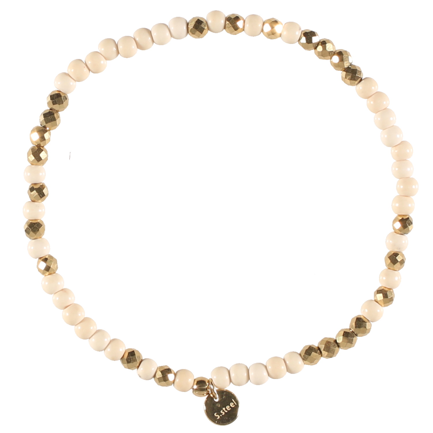Description Bracelet élastique composé de perles en acier doré et de perles en pierre de couleur blanche. Cliquez sur une matière, un thème, une couleur ou une collection pour voir tous les articles associés.