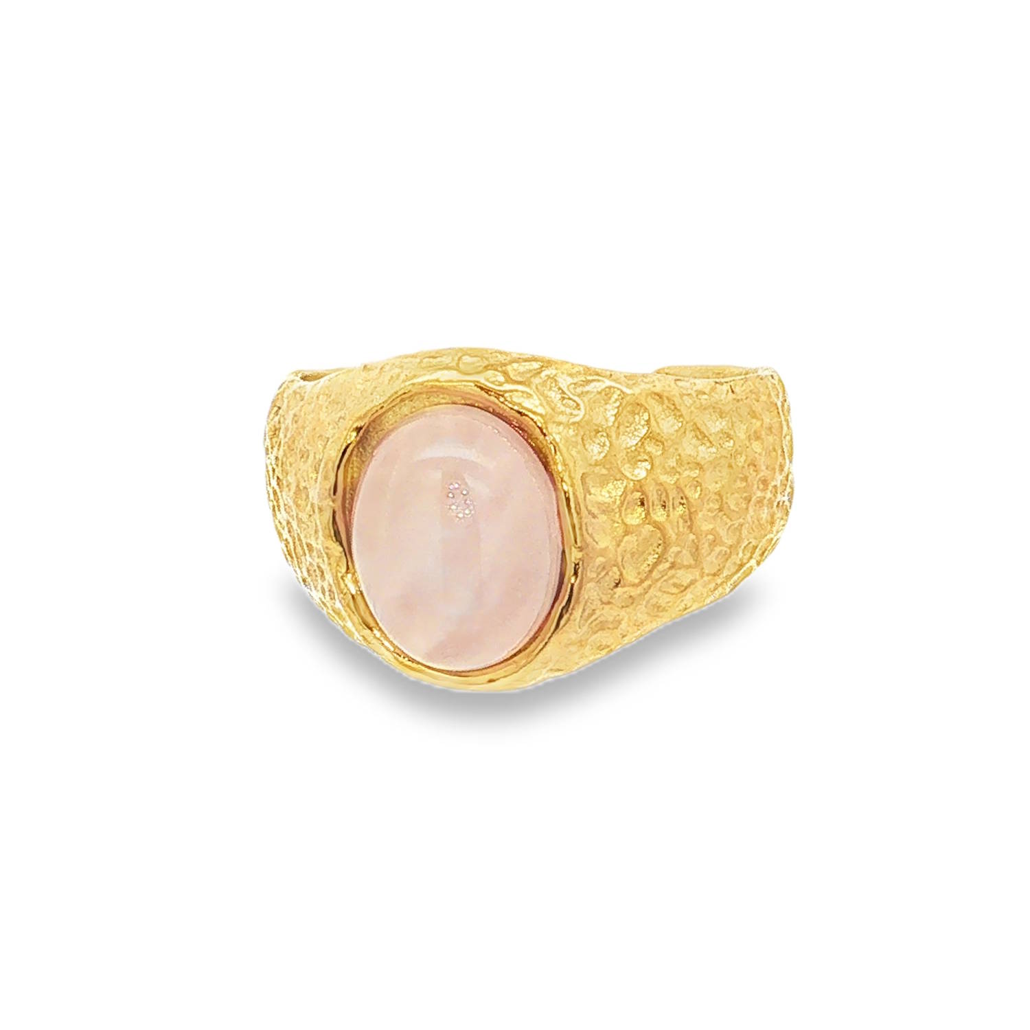 Cette bague sculpturale se distingue par son design organique et audacieux. Conçue en acier inoxydable de haute qualité, elle arbore une finition dorée à la texture martelée, rappelant l'aspect de l'or pépite ou des trésors antiques retrouvés.<br/>Un imposant cabochon ovale en poudre cristalline. Sa teinte rose poudré, à la fois tendre et laiteuse, offre un contraste saisissant avec l'éclat solaire de la monture.<br/>Sa structure ajustable permet de l'adapter facilement à toutes les morphologies de doigts. Ovale  Adolescent Adulte Femme Fille Indémodable