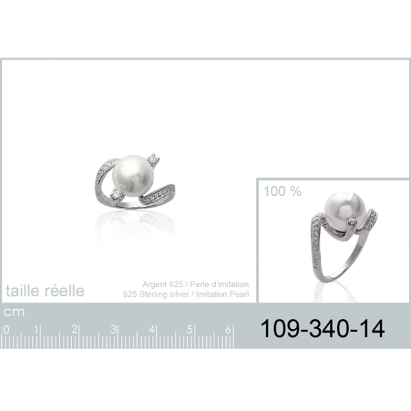 Bague en argent 925/000 rhodié, oxyde de zirconium et perle d'imitation. Boule Perle  Adulte Femme Indémodable Mariage