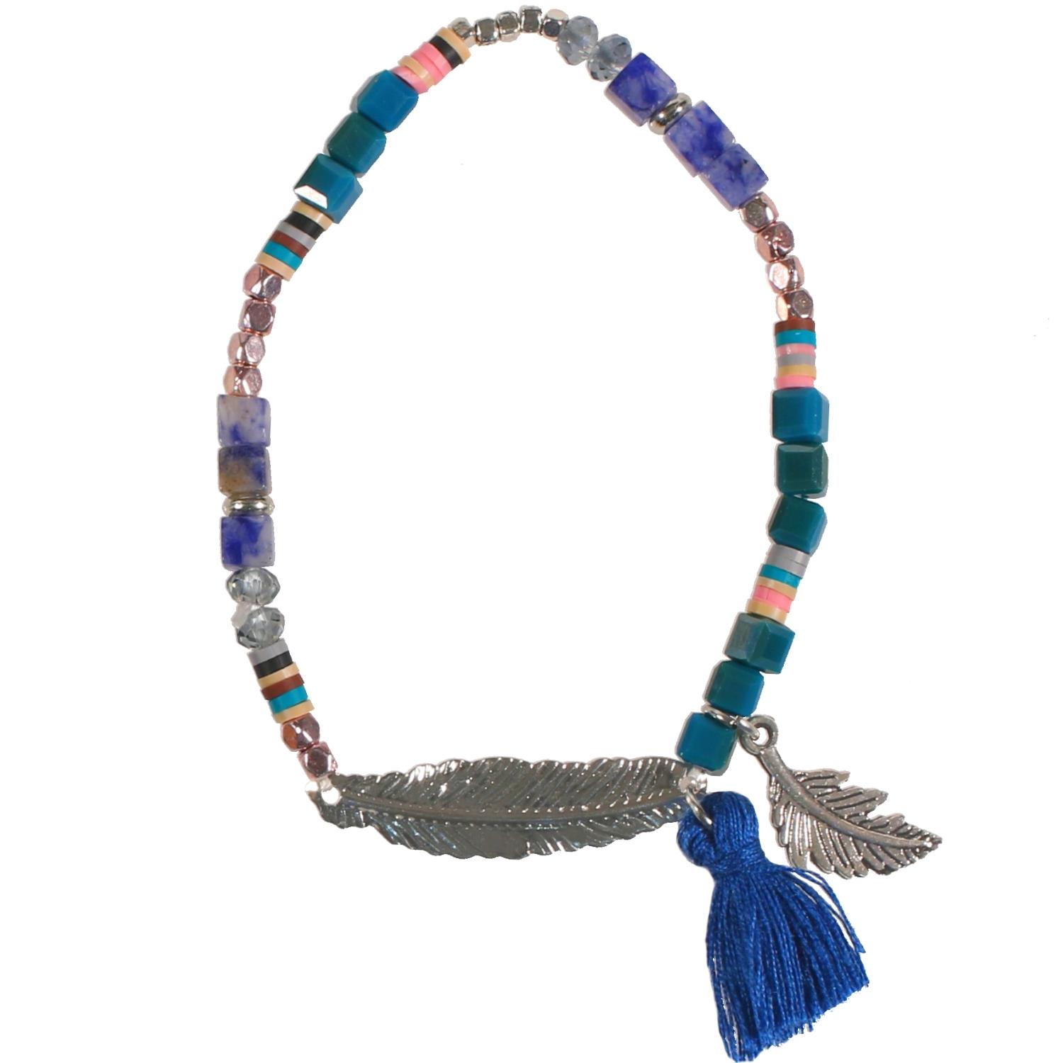 Bracelet fantaisie en métal argenté, résine, rocaille, caoutchouc et textile.
