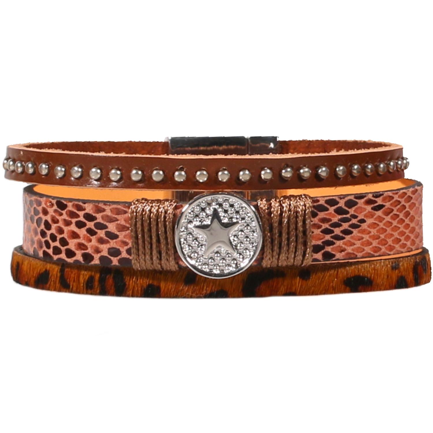 Bracelet fantaisie en métal argenté, suédine, textile et polyuréthane.