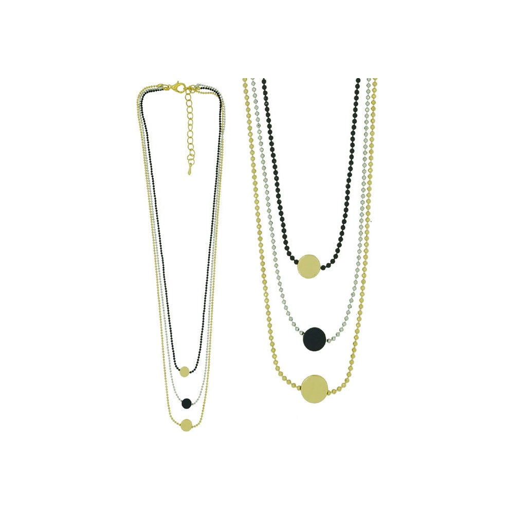 Description Collier fantaisie en métal doré, métal argenté et métal peint. 3 rangs. Cliquez sur une matière, un thème, une couleur ou une collection pour voir tous les articles associés.