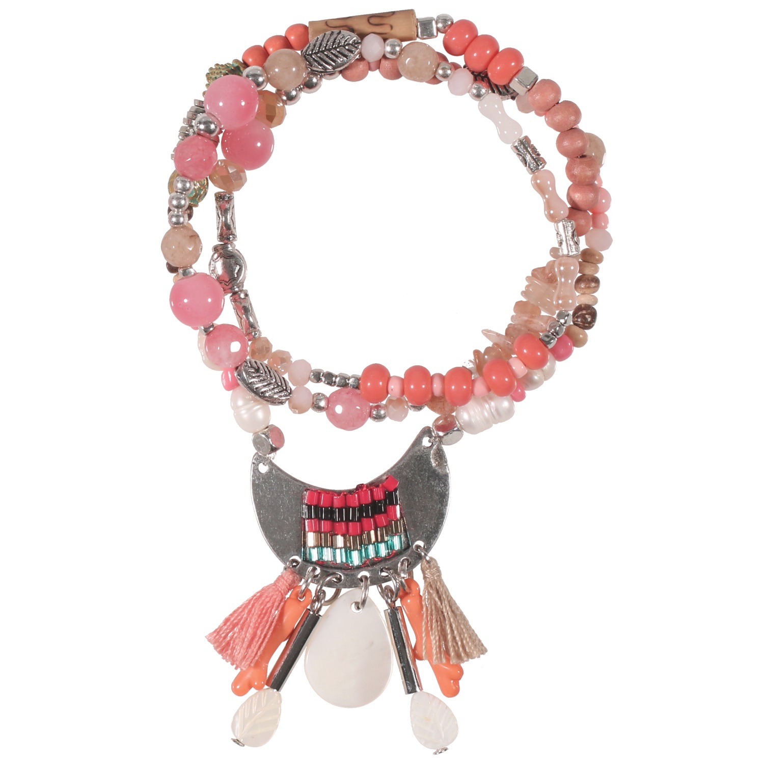 Bracelet fantaisie élastique multi tours en métal argenté, métal peint, bois, caoutchouc, nacre, résine, pierres synthétiques et textile.