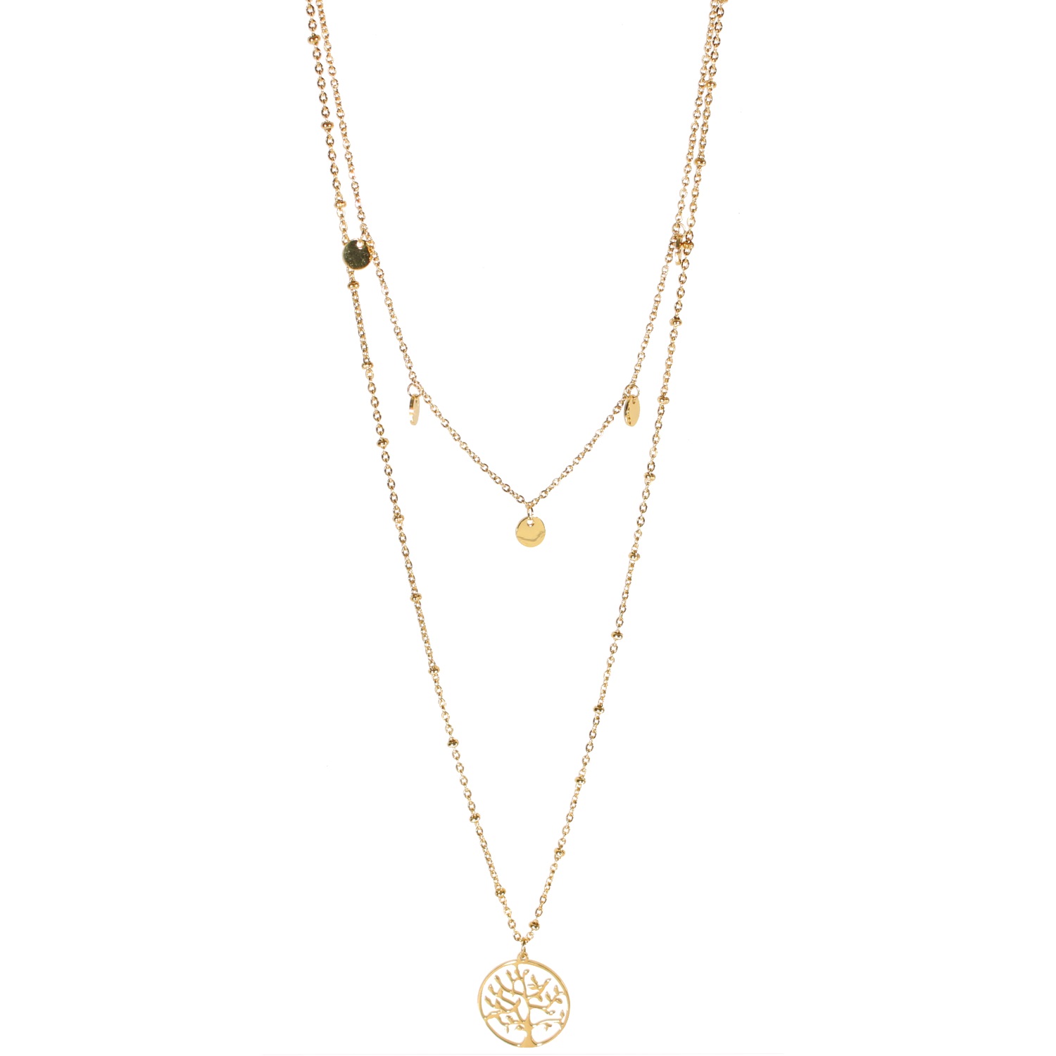Description Collier double rangs composé d'un collier court de 37 cm de long avec pampilles en acier doré ainsi qu'un collier de 53 cm de long avec pendentif arbre de vie en acier doré. L'ensemble peut se régler jusqu'à 5 cm de plus. Longueur 37/53+6 cm [Guide des tailles] Matière(s) Acier . L'acier utilisé dans la bijouterie existe sous plusieurs qualités. Nous utilisons principalement la qualité 316L, qualité qui est utilisée en chirurgie. Cet acier est donc inoxydable et reste très résistant. Fermoir Mousqueton À noter Pendentif arbre de vie 18 mm de diamètre Couleur(s) dominante(s) Doré Public Adolescent , Adulte . Genre Femme , Fille . Saison Indémodable . Thème(s) Nature . Collection Myriade Cliquez sur une matière, un thème, une couleur ou une collection pour voir tous les articles associés.