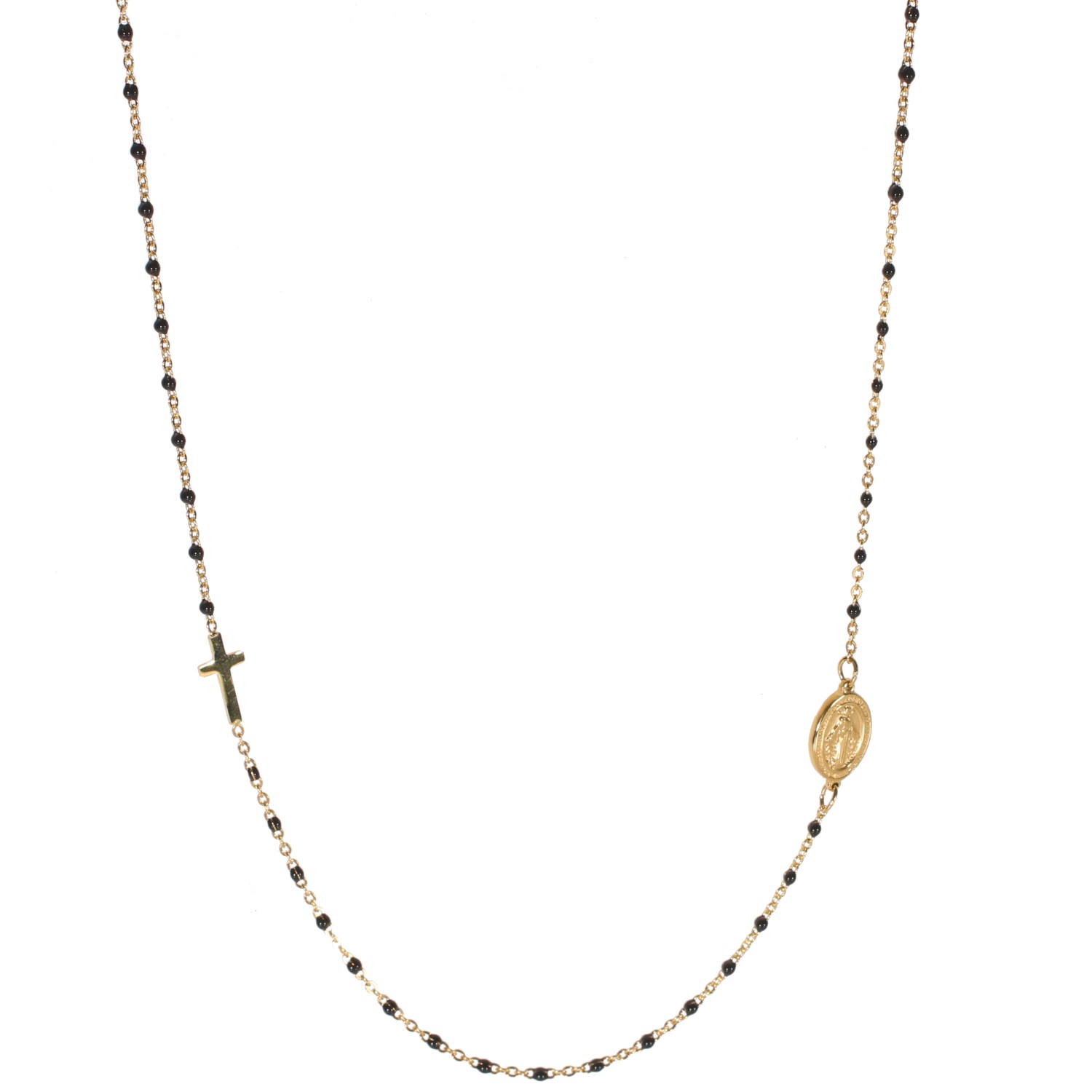 Description Collier avec croix et médaillon de la Vierge en acier doré et perles en émail. Cliquez sur une matière, un thème, une couleur ou une collection pour voir tous les articles associés.