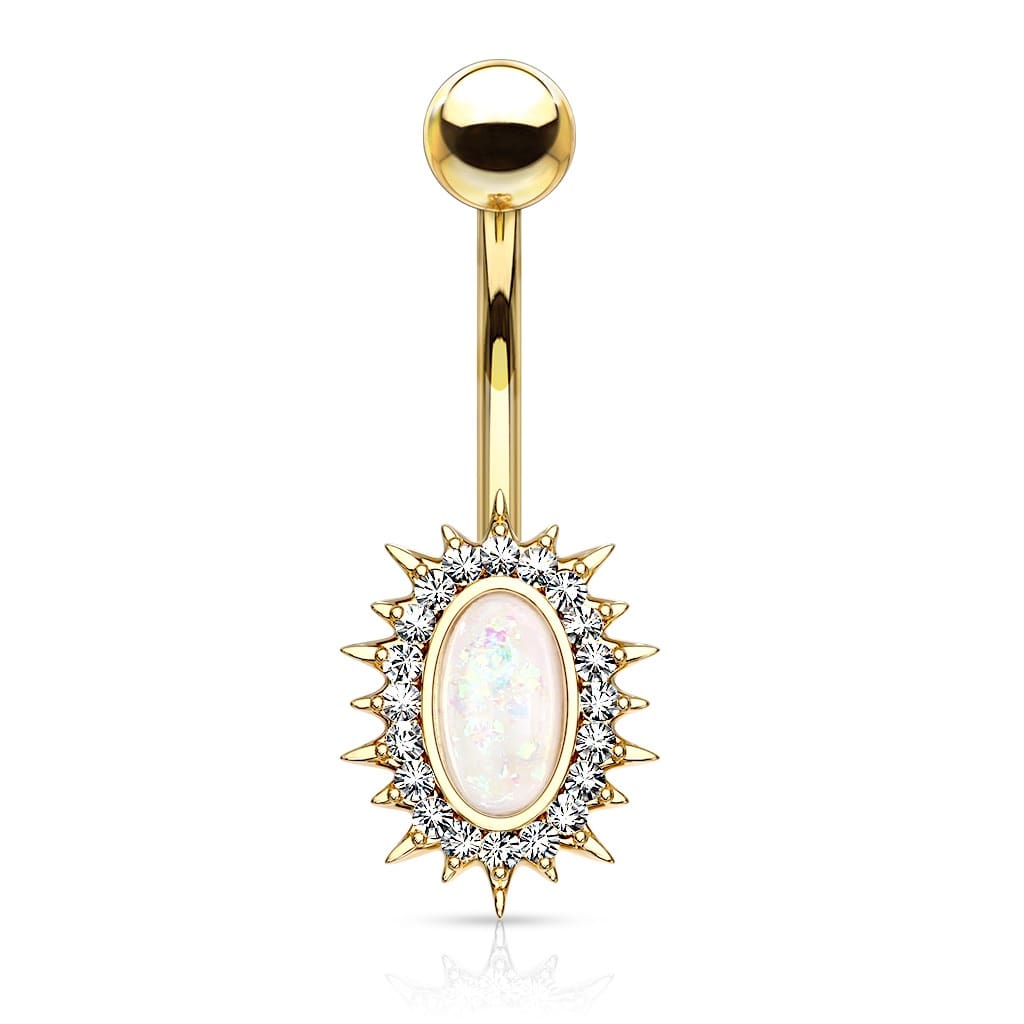 Piercing nombril en acier doré, cristaux en verre et pierre d'imitation opale.
