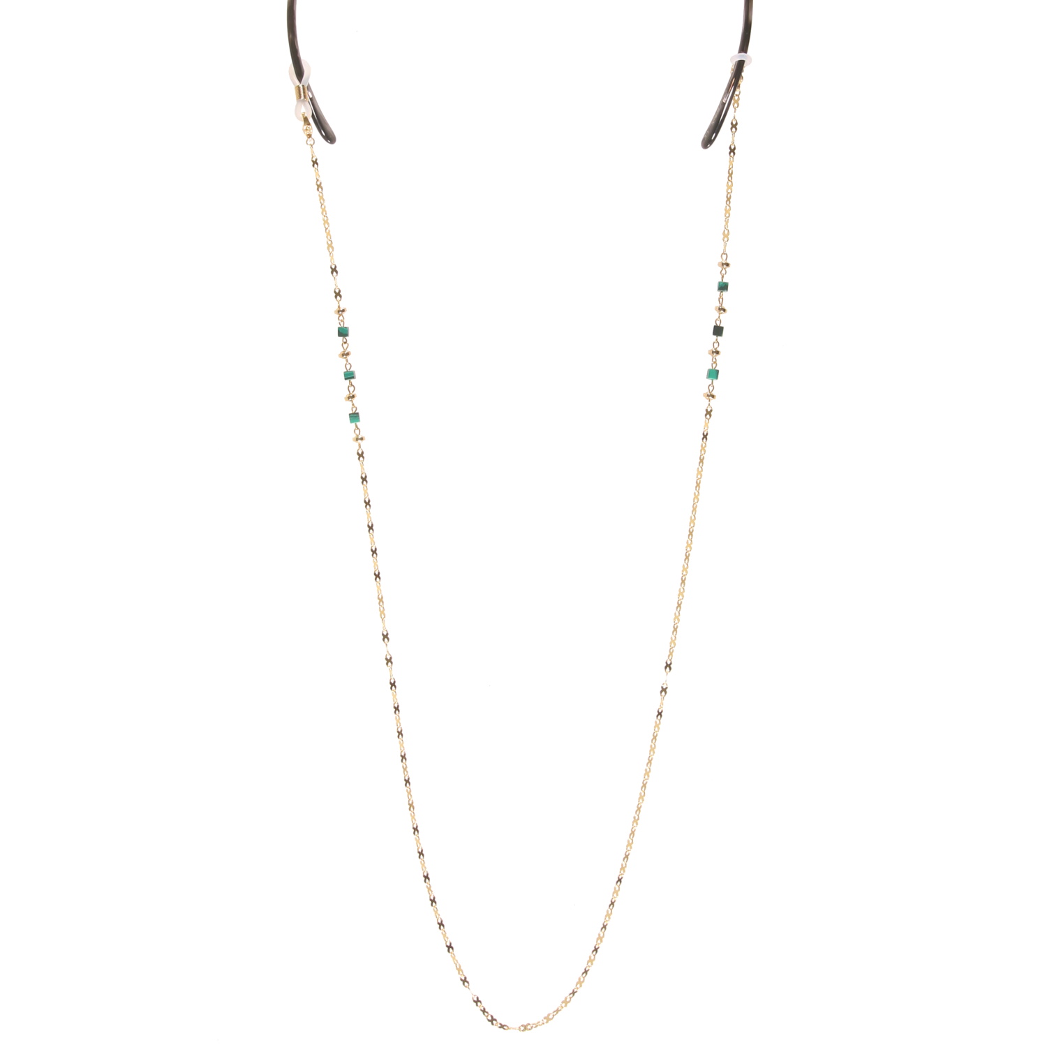Collier chaîne de lunettes en acier doré surmonté de perles cubiques avec attaches en caoutchouc.