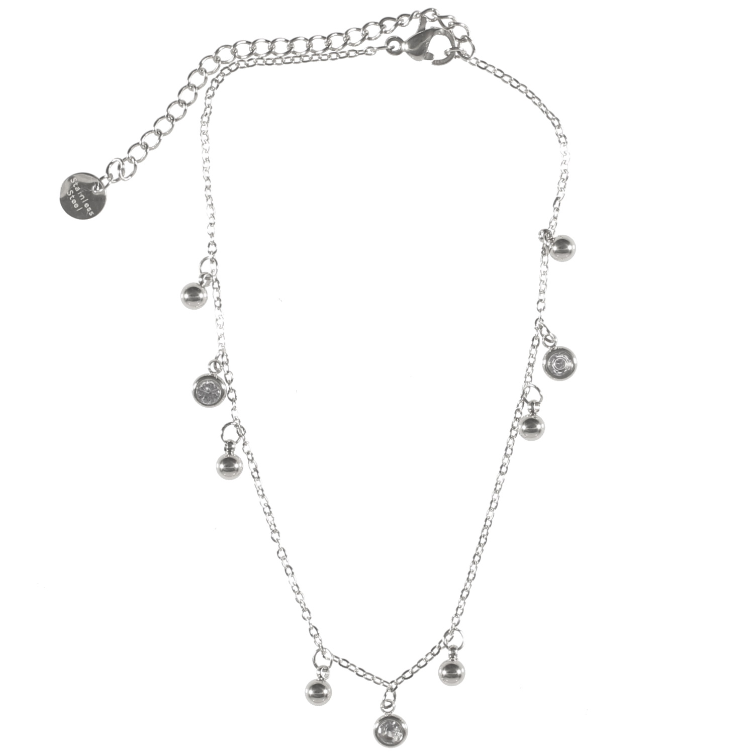 Bracelet chaîne de cheville composé d'une chaîne en acier argenté, des pampilles serties clos de cristaux et pampilles boules en acier argenté.