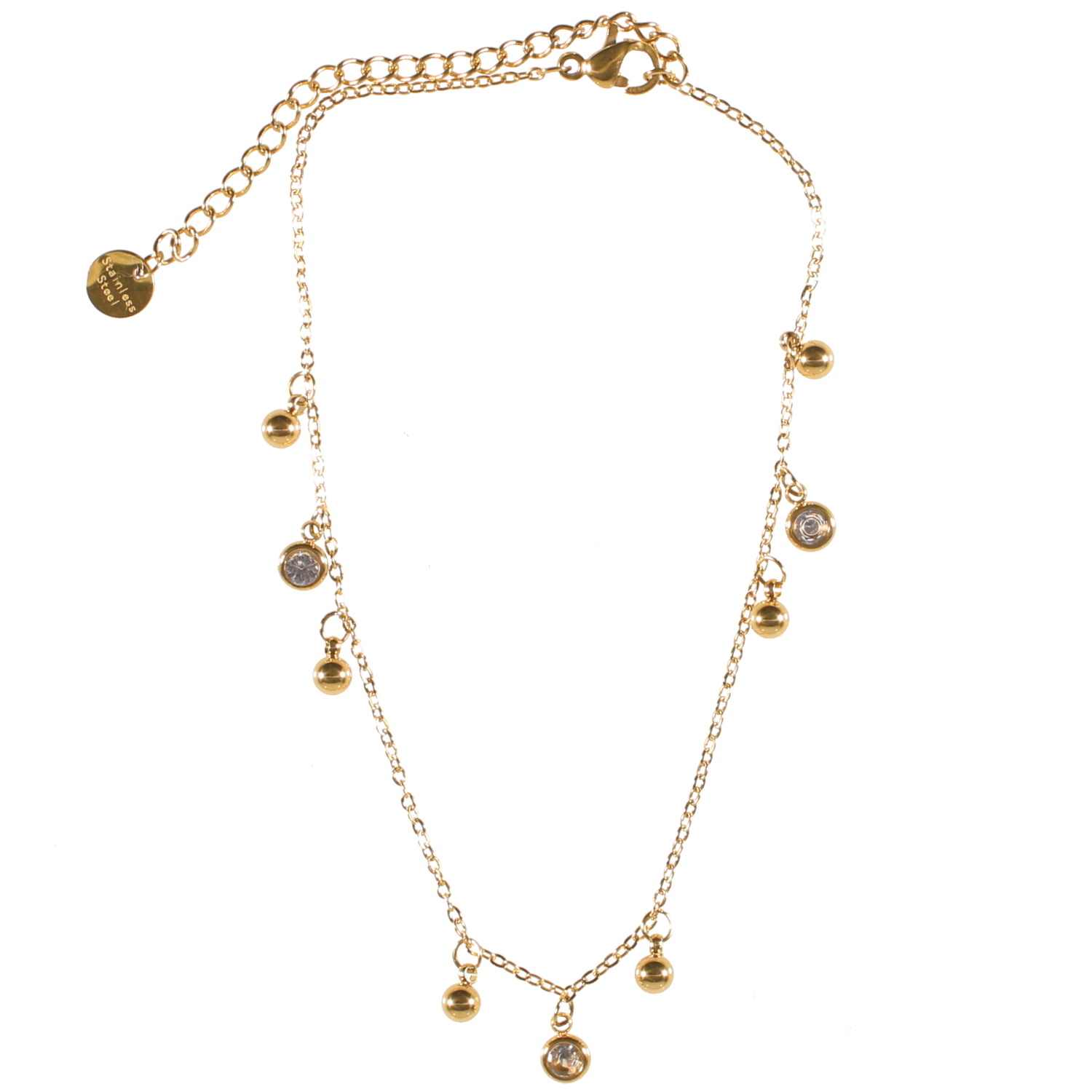 Bracelet chaîne de cheville composé d'une chaîne en acier doré, des pampilles serties clos de cristaux et pampilles boules en acier doré.