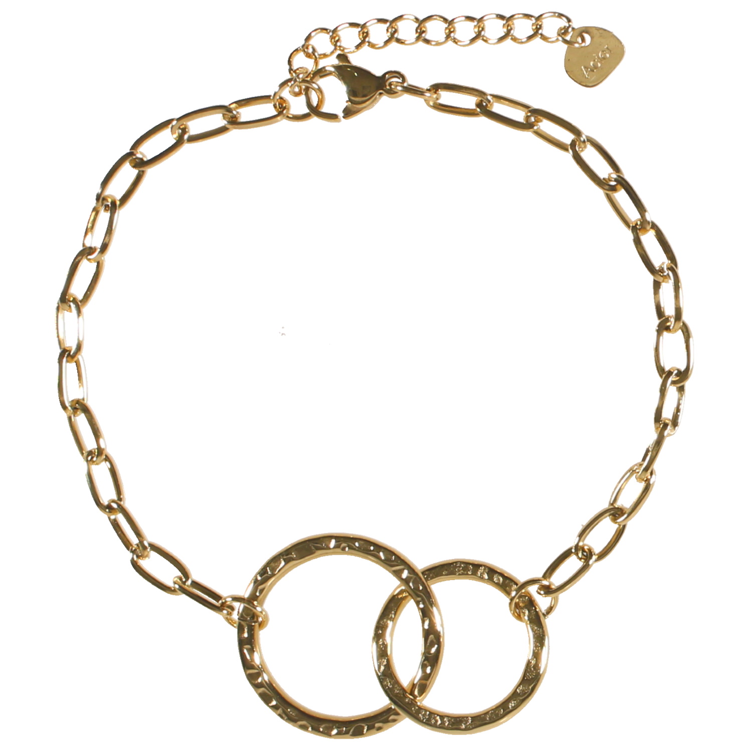 Description Bracelet composé d'une chaîne et de deux cercles martelés entrelacés en acier doré. Fermoir mousqueton avec 3 cm de rallonge. Longueur 17+3 cm [Guide des tailles] Largeur 20 mm Matière(s) Acier . L'acier utilisé dans la bijouterie existe sous plusieurs qualités. Nous utilisons principalement la qualité 316L, qualité qui est utilisée en chirurgie. Cet acier est donc inoxydable et reste très résistant. Fermoir Mousqueton Couleur(s) dominante(s) Doré Public Adolescent , Adulte . Genre Femme , Fille . Saison Indémodable . Cliquez sur une matière, un thème, une couleur ou une collection pour voir tous les articles associés.