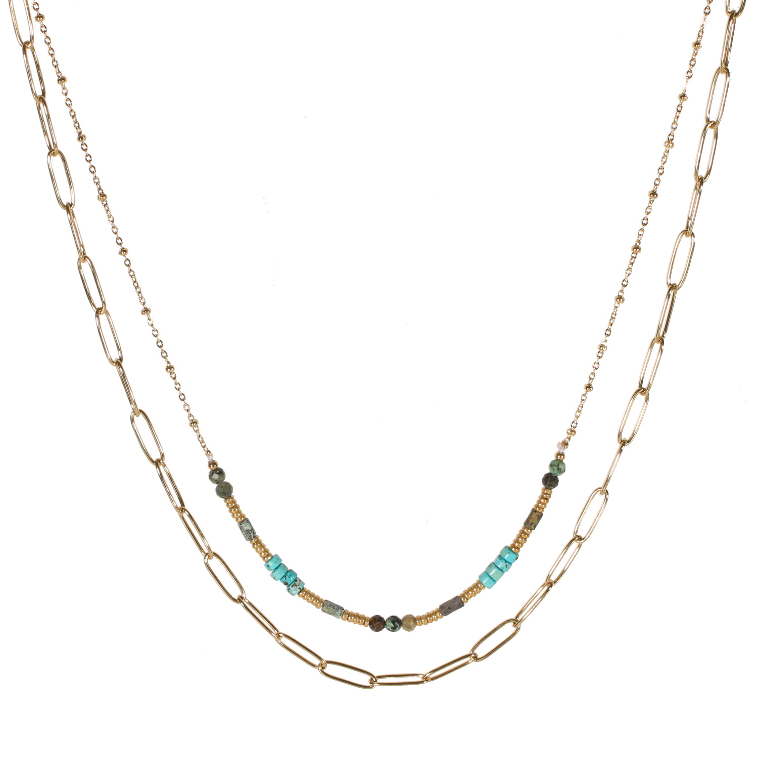 Collier double rangs composé d'une chaîne de 39 cm de long avec perles en acier doré et des perles en véritable pierre de turquoise d'Afrique, ainsi qu'une chaîne de 42 cm de long en acier doré.