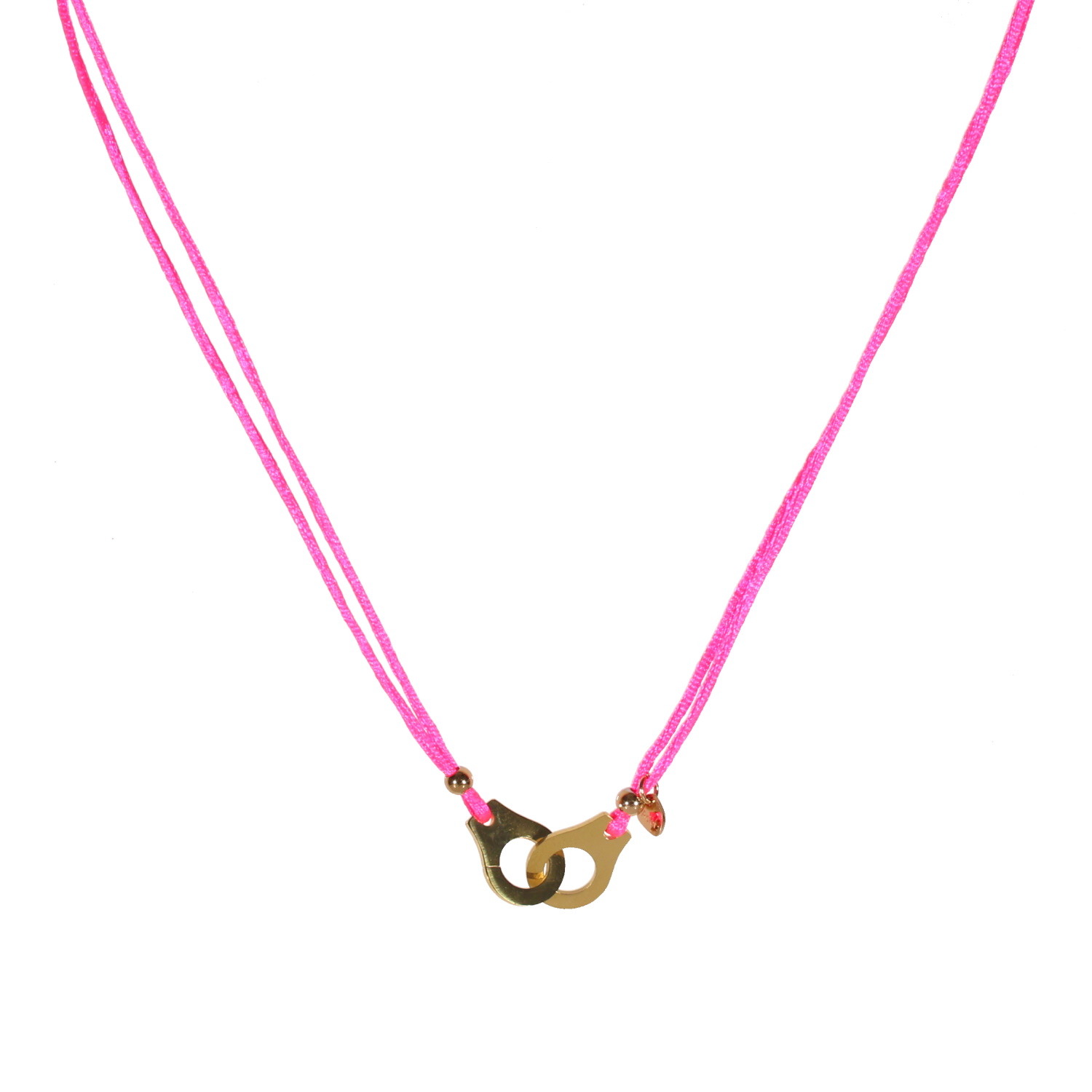 Collier composé d'un cordon en coton de couleur rose fluo et d'une paire de menottes en acier doré.