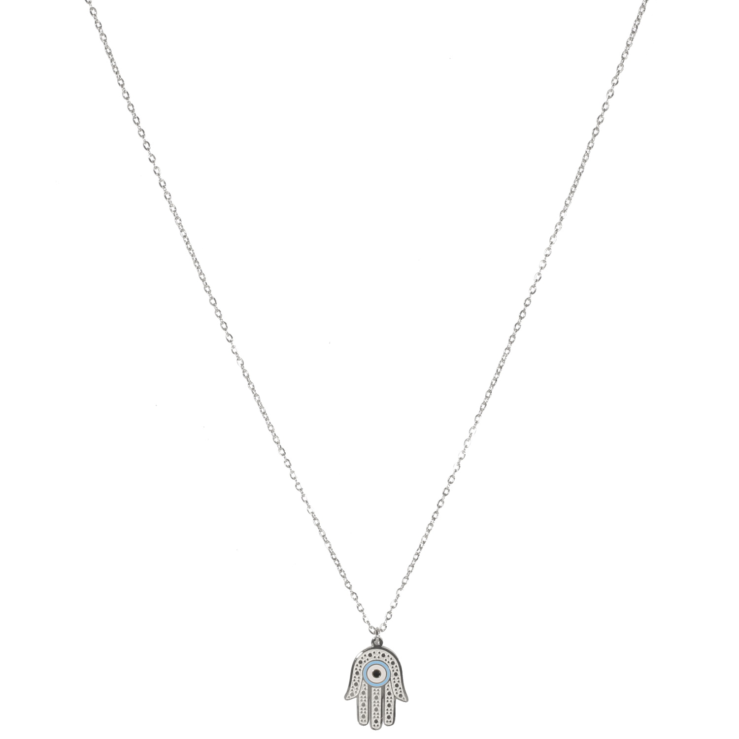 Collier composé d'une chaîne en acier argenté et d'un pendentif main de Fatma avec un œil en émail de couleur.