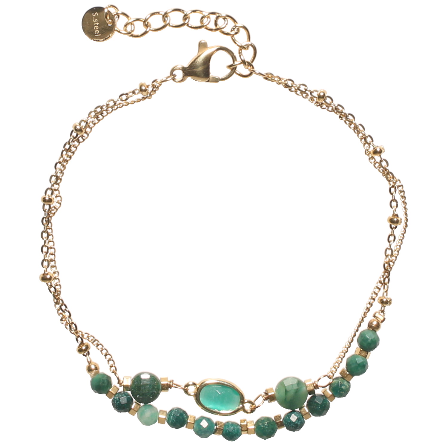 Description Bracelet double rangs composé d'une chaîne en acier doré avec des perles rondes de couleur verte, ainsi qu'une chaîne en acier doré avec deux perles rondes de couleur verte et d'un cristal vert serti clos. Fermoir mousqueton avec 3 cm de rallonge. Longueur 15+3 cm [Guide des tailles] Largeur 8 mm Matière(s) Acier , Rocaille . L'acier utilisé dans la bijouterie existe sous plusieurs qualités. Nous utilisons principalement la qualité 316L, qualité qui est utilisée en chirurgie. Cet acier est donc inoxydable et reste très résistant. Fermoir Mousqueton Couleur(s) dominante(s) Doré , Vert Public Adolescent , Adulte . Genre Femme , Fille . Saison Indémodable . Cliquez sur une matière, un thème, une couleur ou une collection pour voir tous les articles associés.