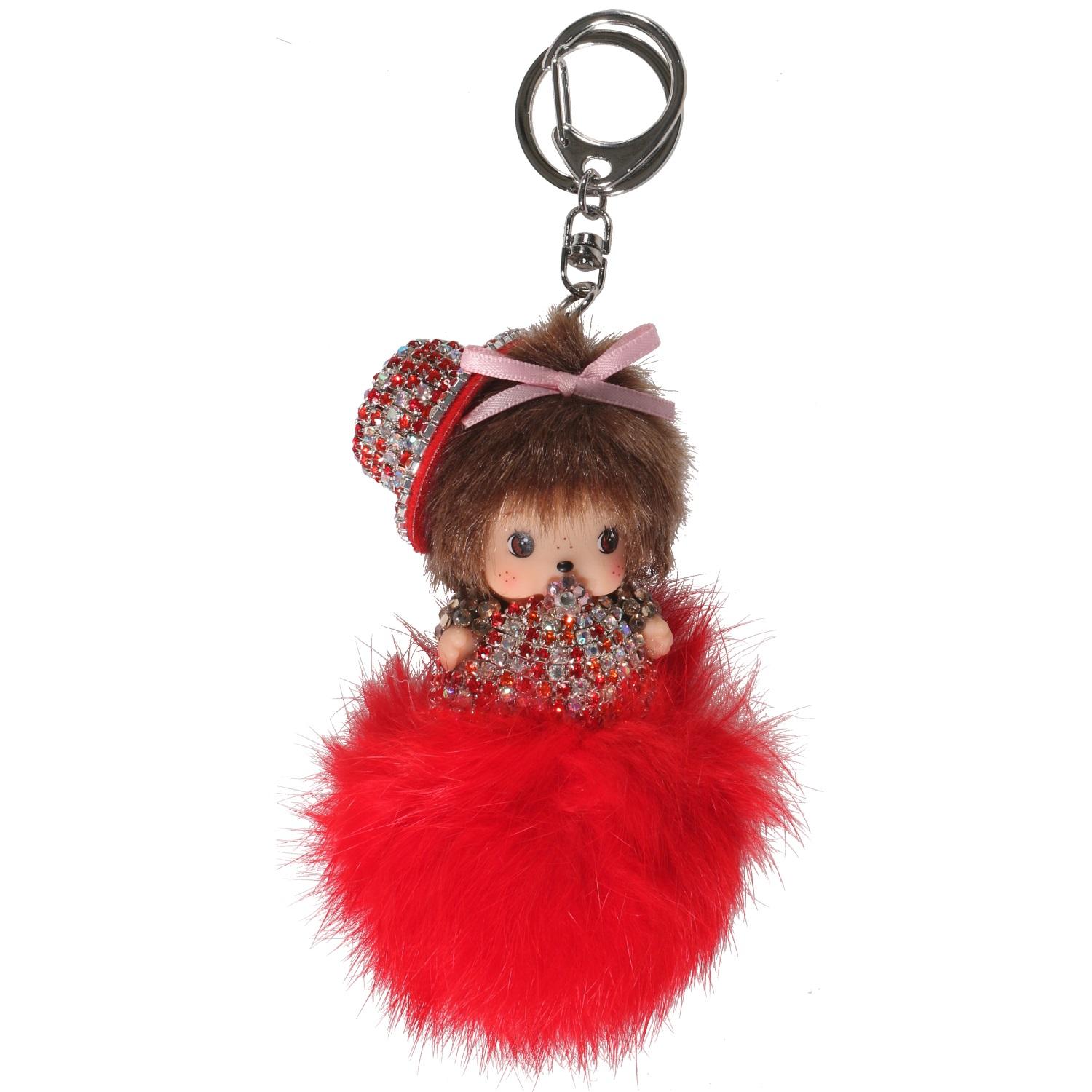 Porte-clés fantaisie en métal argenté, textile, plastique et cristaux synthétiques.