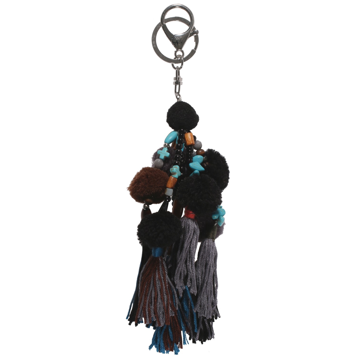 porte-clés en métal argenté, rocaille, bois et textile.
