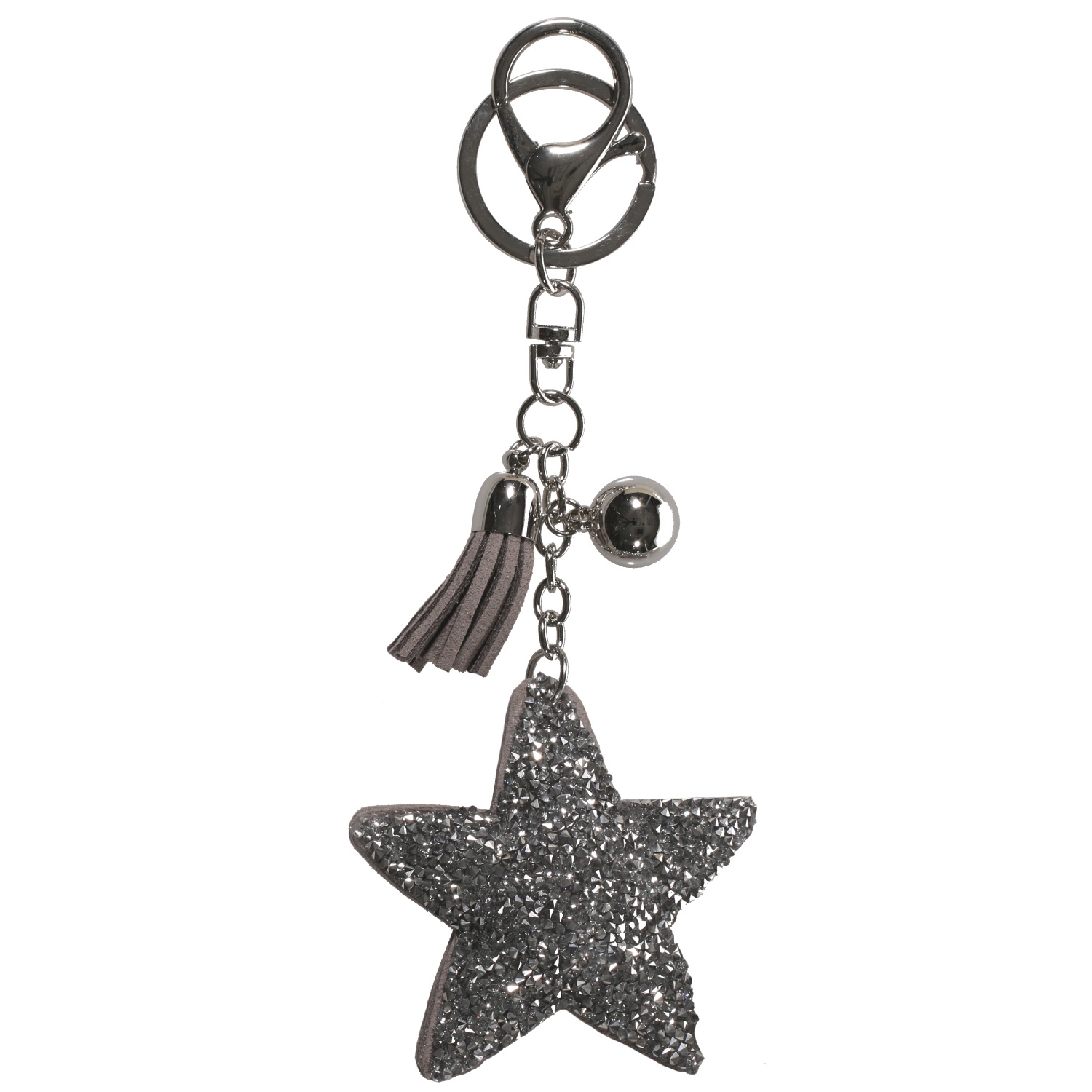 Porte-clés fantaisie Etoile en métal argenté, suédine et cristaux synthétiques.