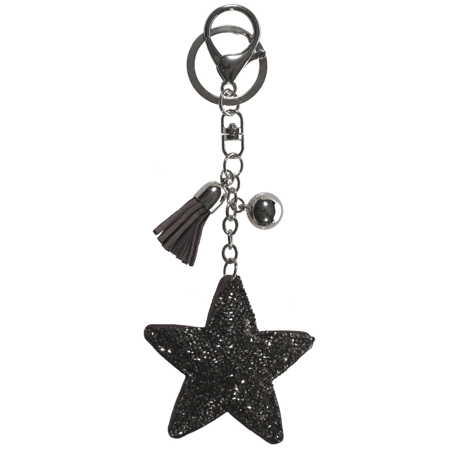 Porte-clés fantaisie Etoile en métal argenté, suédine et cristaux synthétiques.
