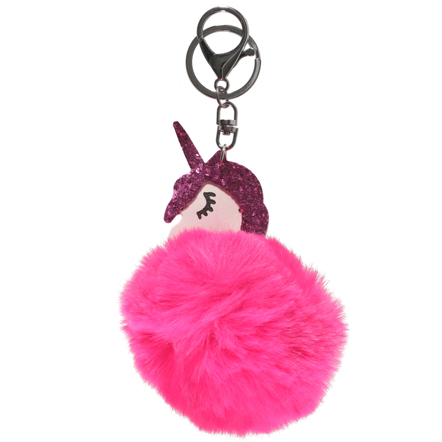 Porte-clés fantaisie Licorne en métal argenté, polyuréthane, paillettes et pompon en textile.