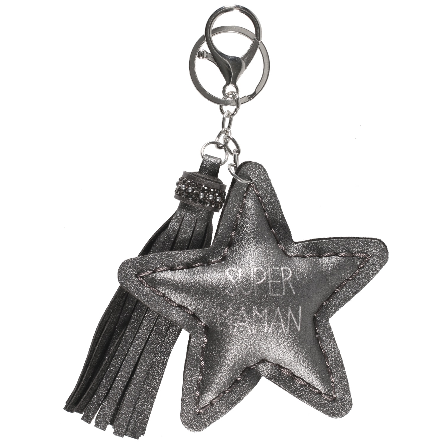 Porte-clés fantaisie étoile avec le message Super maman en métal argenté, suédine et cristaux synthétiques.