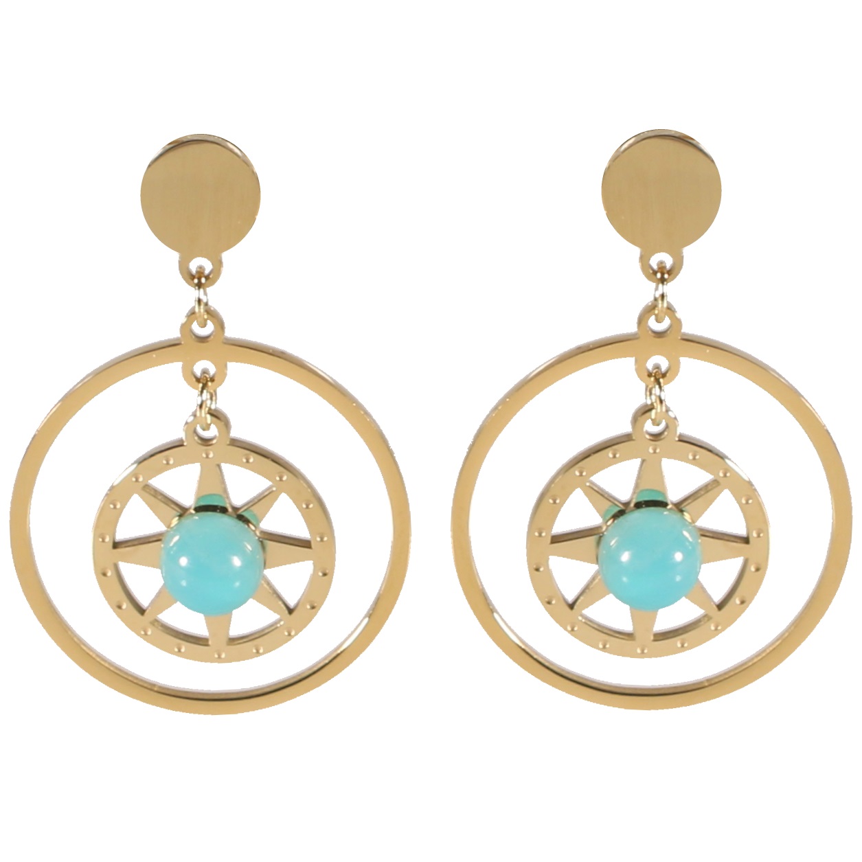 Boucles d'oreilles pendantes composées d'un cercle en acier doré et d'un cercle avec étoile en acier doré surmonté d'une véritable pierre amazonite.