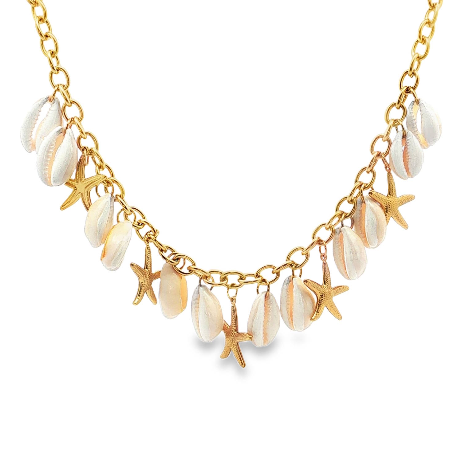 Ce collier se distingue par son accumulation généreuse de breloques alternant entre coquillages naturels (cauris) de couleur blanc crème avec des reflets naturels et des étoiles de mer finement ciselées en acier doré.