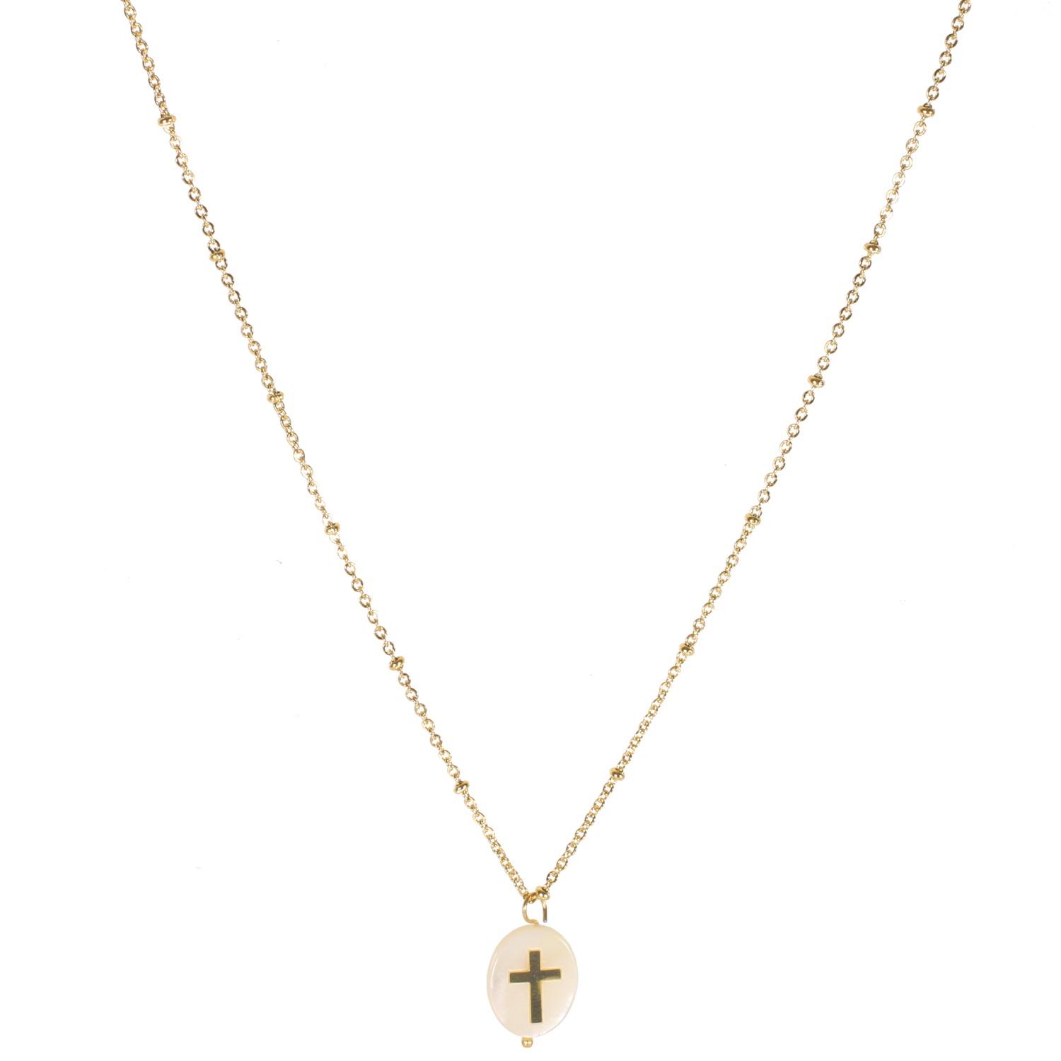 Collier avec pendentif croix en acier doré et nacre.