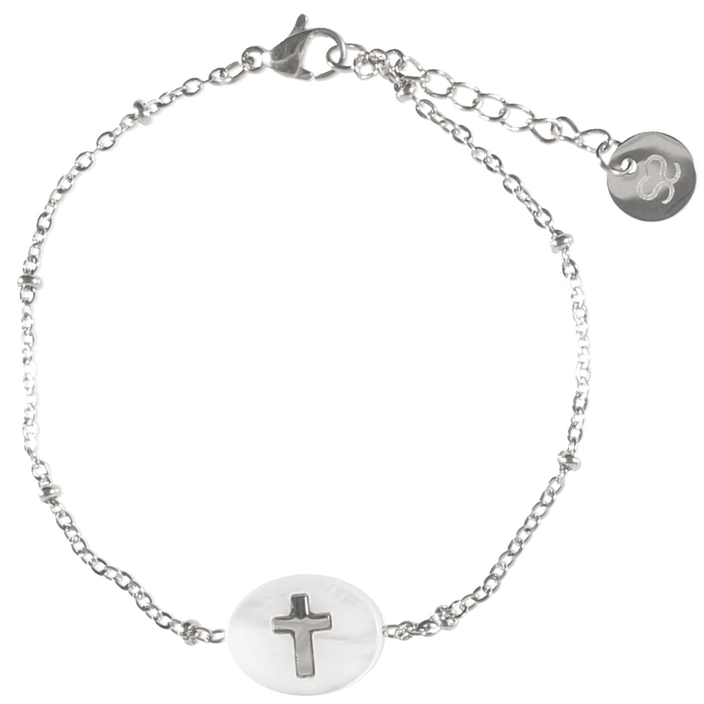 Bracelet avec croix en acier argenté et nacre. Croix Ovale  Adolescent Adulte Femme Fille Indémodable Religion Symboles