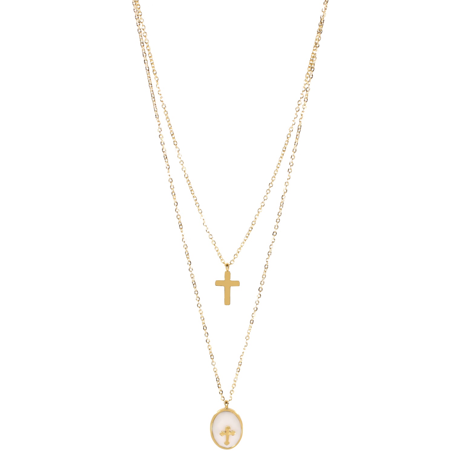 Collier double rangs avec pendentifs de croix en acier doré et pierre de couleur.