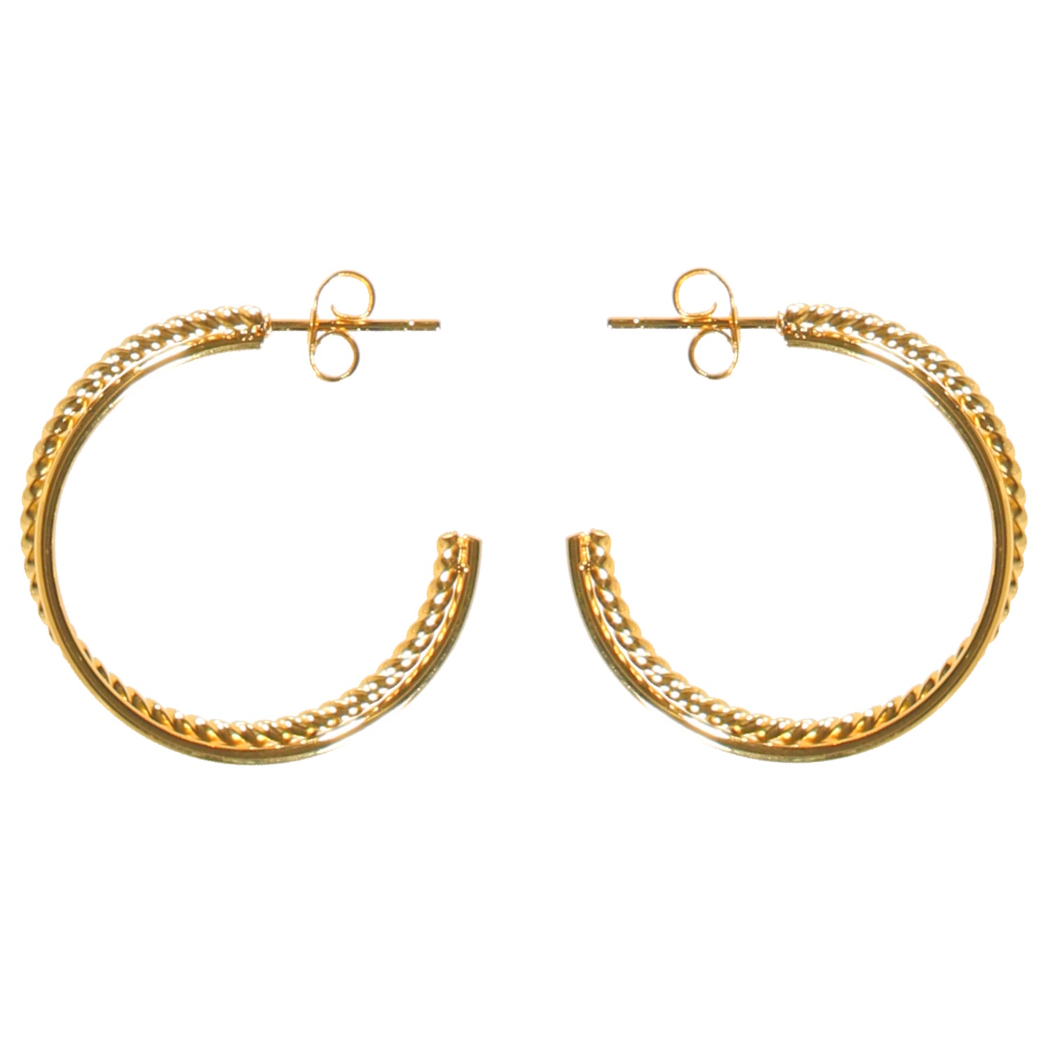 Description Boucles d'oreilles créoles ouvertes double fils lisse et motif de tresse en acier doré. Largeur 2 mm Diamètre 20 mm [Guide des tailles] Matière(s) Acier . L'acier utilisé dans la bijouterie existe sous plusieurs qualités. Nous utilisons principalement la qualité 316L, qualité qui est utilisée en chirurgie. Cet acier est donc inoxydable et reste très résistant. Fermoir Tiges poussettes Couleur(s) dominante(s) Doré Public Adolescent , Adulte . Genre Femme , Fille . Saison Indémodable . Cliquez sur une matière, un thème, une couleur ou une collection pour voir tous les articles associés.