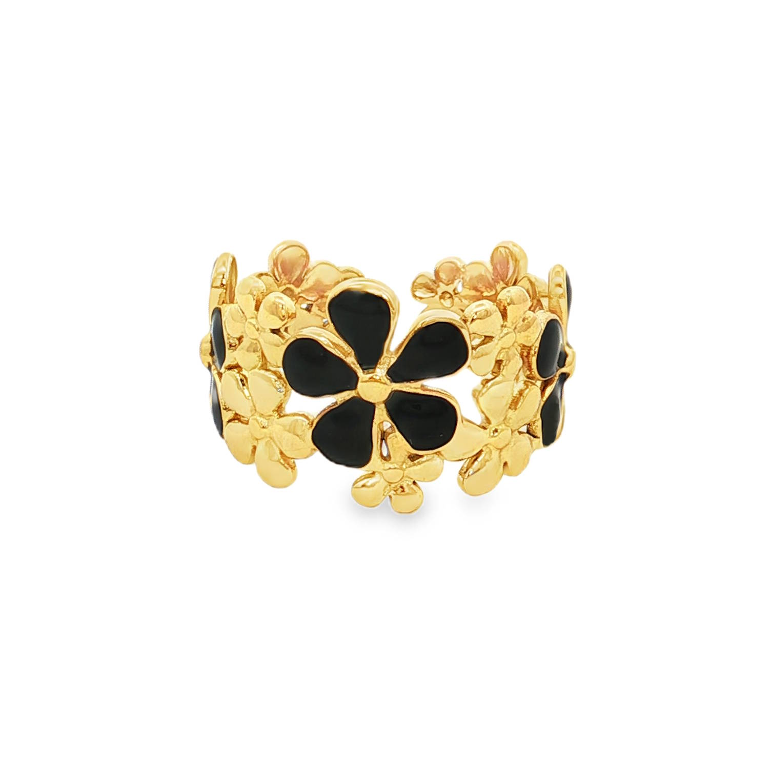 L'association de l'acier doré et de l'émail noir profond crée un effet visuel puissant. Le noir souligne les contours des pétales et donne de la profondeur au motif.
