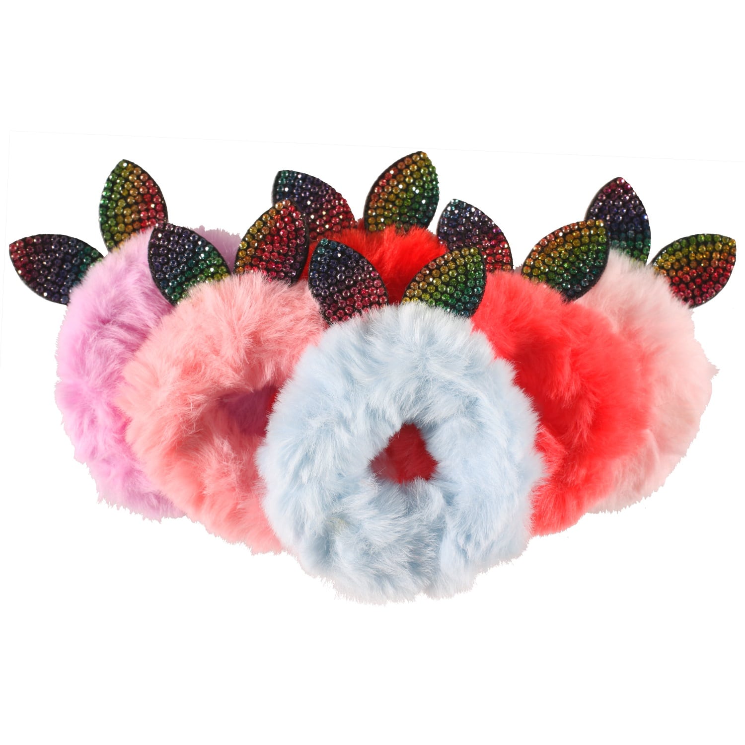 Chouchou élastique en textile de couleur et oreilles en suédine et strass multicolore.