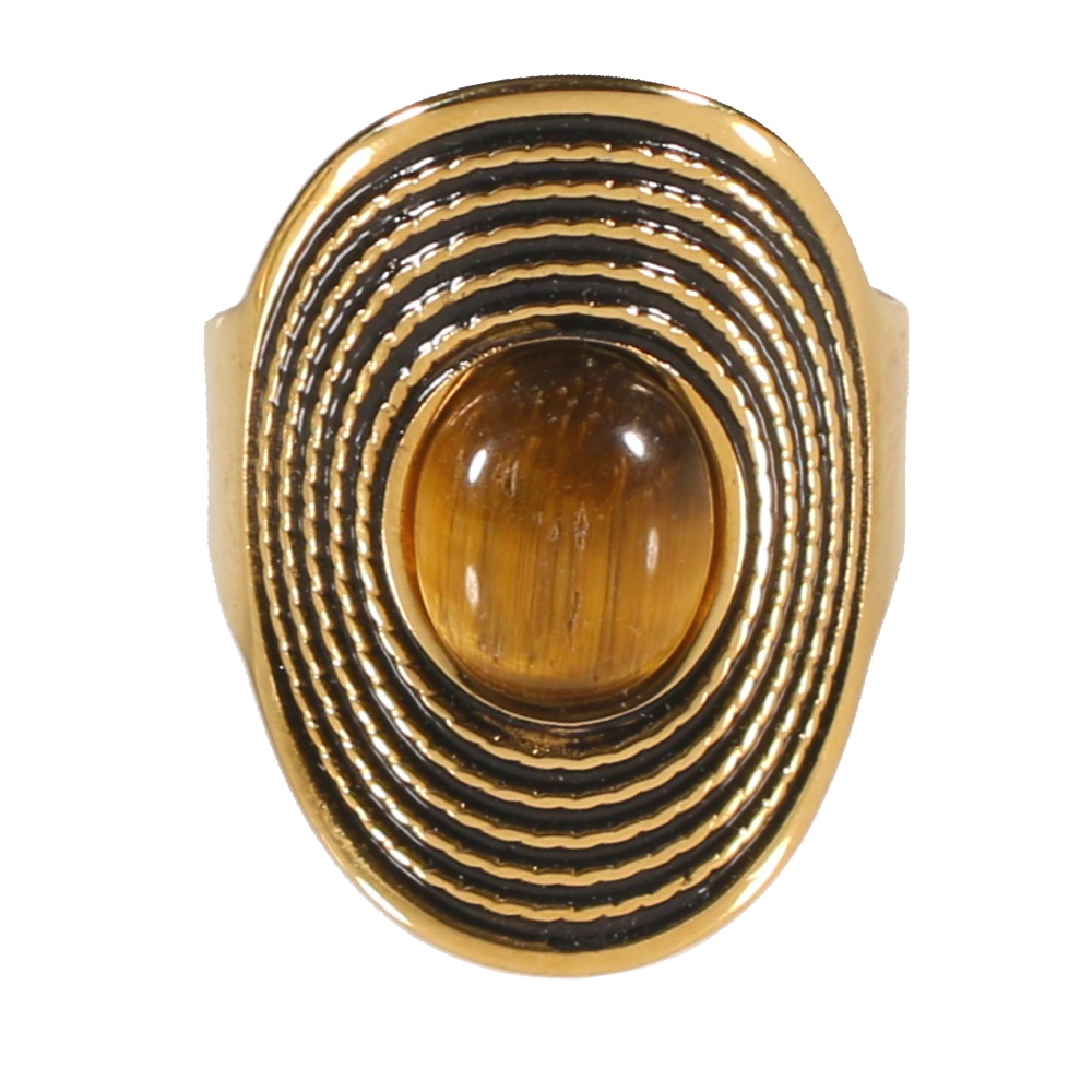 Bague de forme ovale aux motifs en relief en acier doré surmontée d'une pierre œil de Tigre sertie clos.