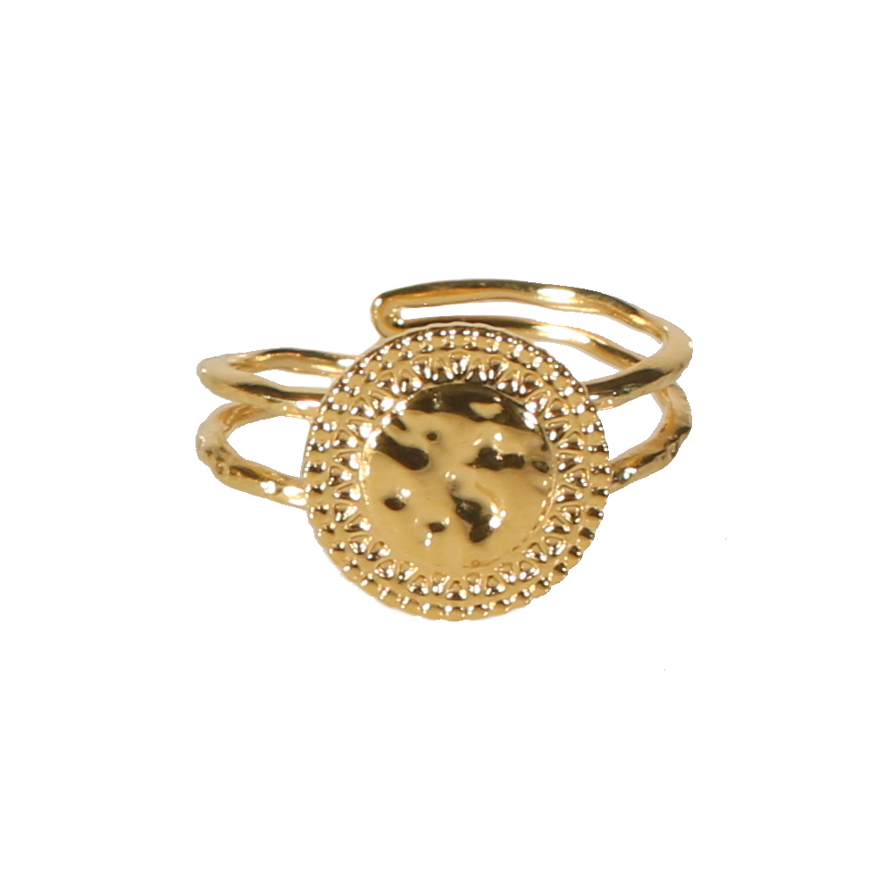 Description Bague surmontée d'une pastille martelée en acier doré. Taille ajustable. Largeur 12 mm Matière(s) Acier . L'acier utilisé dans la bijouterie existe sous plusieurs qualités. Nous utilisons principalement la qualité 316L, qualité qui est utilisée en chirurgie. Cet acier est donc inoxydable et reste très résistant. Fermoir Aucun Couleur(s) dominante(s) Doré Public Adolescent , Adulte . Genre Femme , Fille . Saison Indémodable . Cliquez sur une matière, un thème, une couleur ou une collection pour voir tous les articles associés.