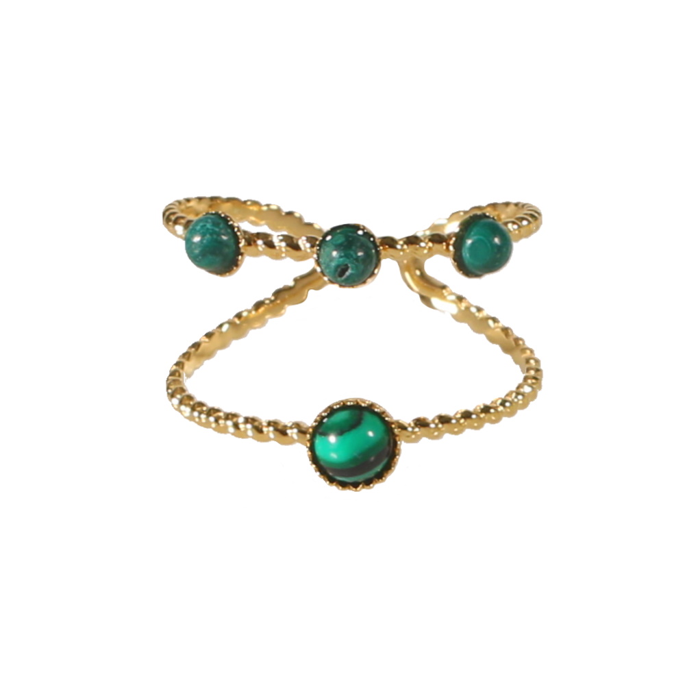 Bague double rangs en acier doré surmontée de 5 cabochons en véritable pierre de malachite.