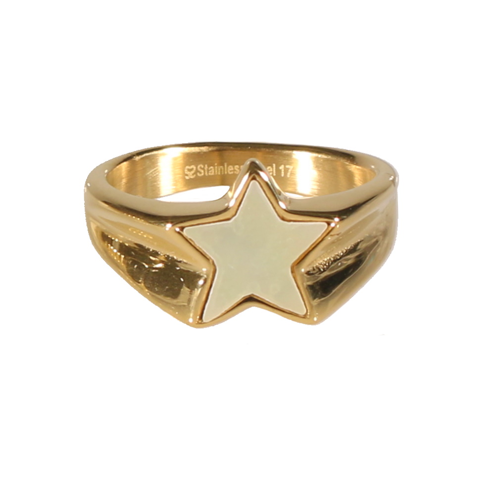 Description Bague en acier doré surmontée d'une étoile en nacre sertie clos. Disponible en taille 14 - 15 - 16 - 17 selon arrivage.