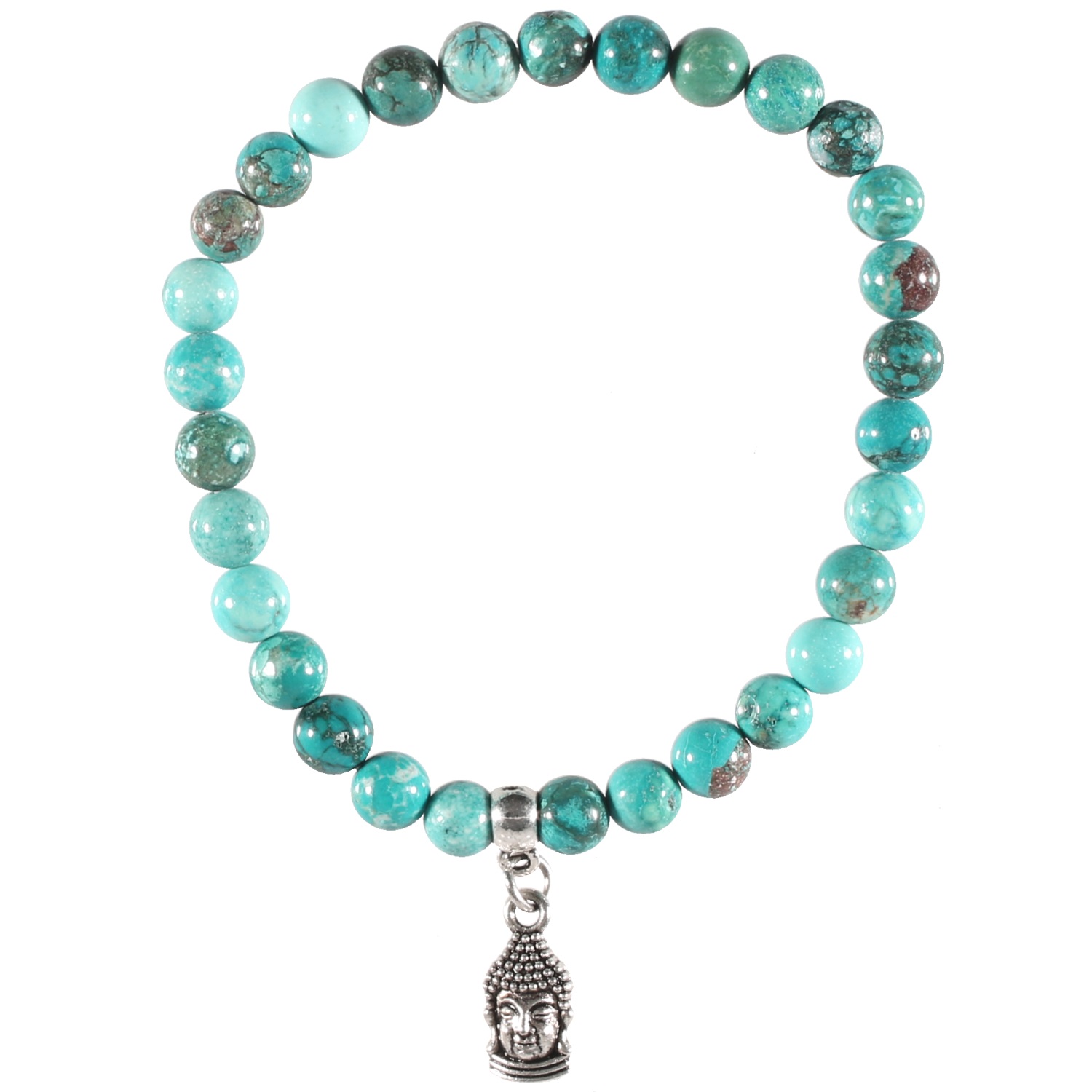 Bracelet élastique avec tête de Bouddha en métal argenté et boules en pierre turquoise.