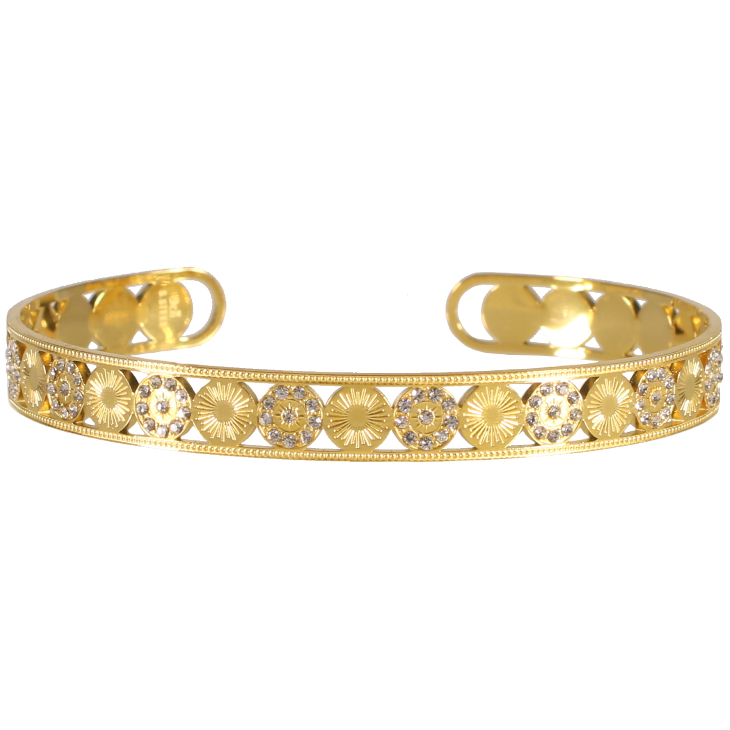 Description Bracelet jonc ouvert et rigide composé de pastilles rondes avec motifs de rayons de soleil en acier 316L doré et certaines pavées de strass en verre. Largeur 7 mm Diamètre 58 mm [Guide des tailles] Matière(s) Acier , Verre . L'acier utilisé dans la bijouterie existe sous plusieurs qualités. Nous utilisons principalement la qualité 316L, qualité qui est utilisée en chirurgie. Cet acier est donc inoxydable et reste très résistant. Fermoir Aucun Couleur(s) dominante(s) Doré Public Adolescent , Adulte . Genre Femme , Fille . Saison Indémodable . Collection Brillancy Cliquez sur une matière, un thème, une couleur ou une collection pour voir tous les articles associés.