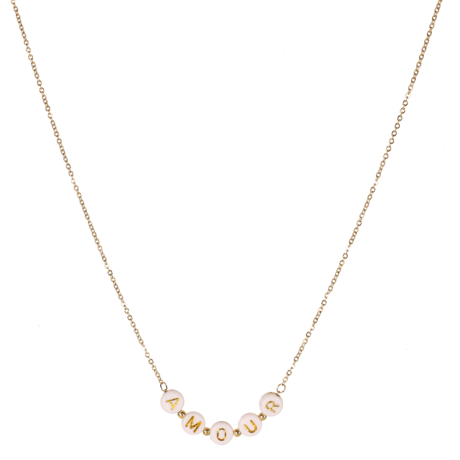 Collier composé d'une chaîne en acier doré et des perles rondes avec des lettres pour faire le mot AMOUR.