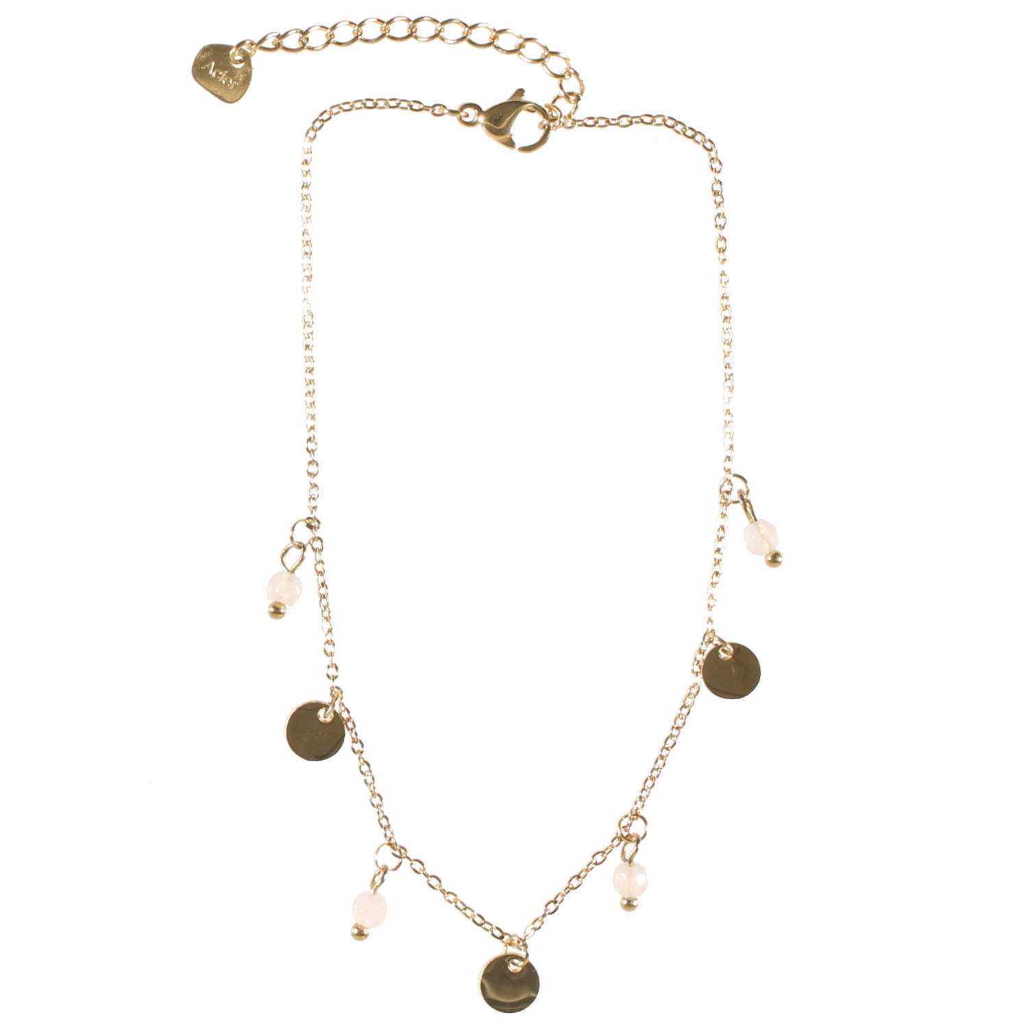 Bracelet chaîne de cheville composé d'une chaîne avec pampilles rondes en acier doré et de 4 perles en véritable pierre de jade blanc.