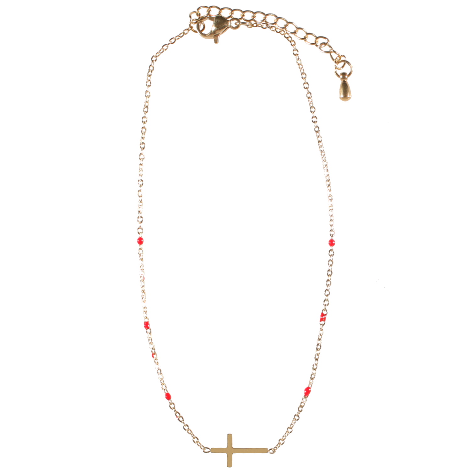 Bracelet chaîne de cheville composé d'une chaîne et d'une croix en acier doré et de perles en émail de couleur rouge.