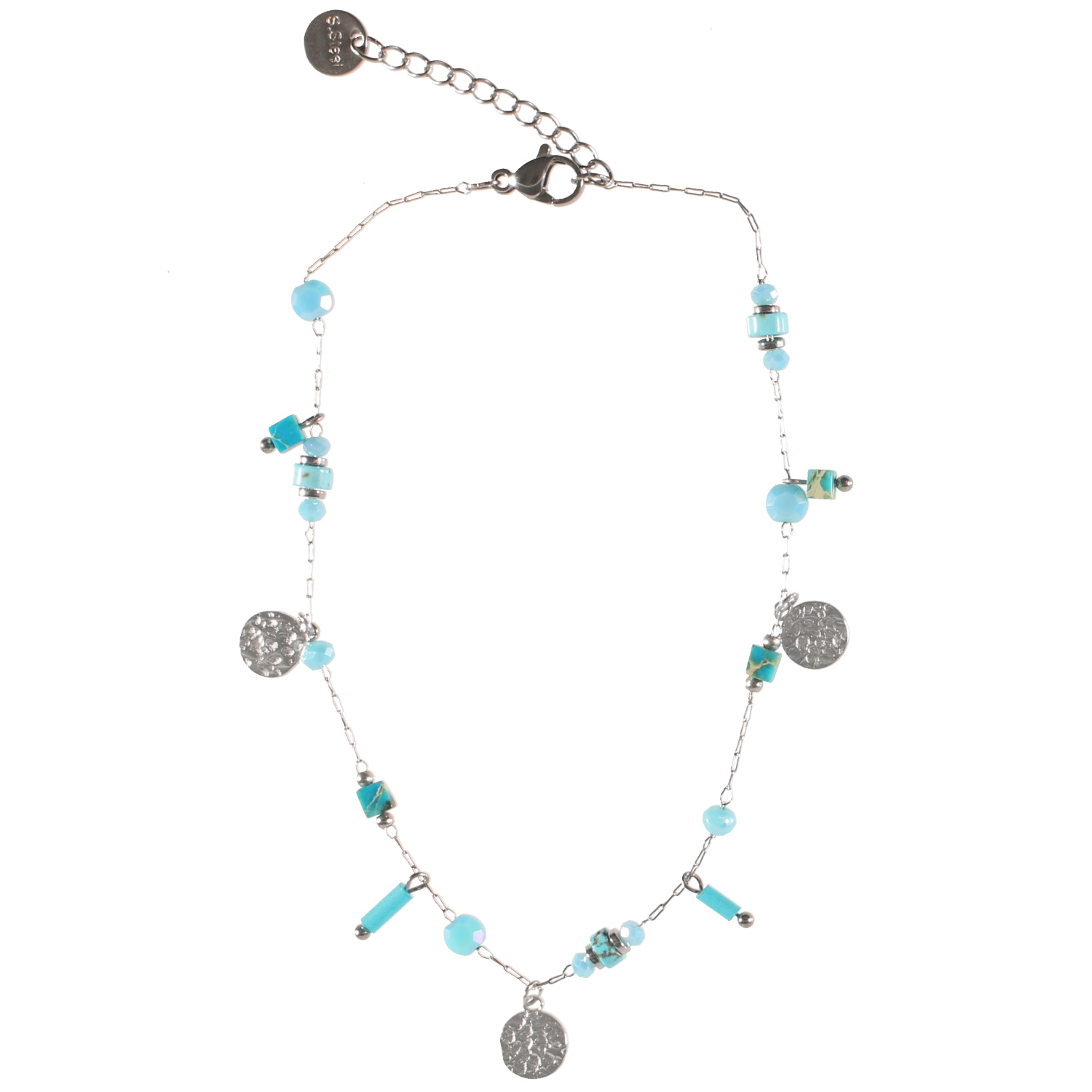 Description Bracelet chaîne de cheville composé d'une chaîne en acier argenté, de perles de couleur turquoise et de pampilles rondes martelées en acier argenté. Fermoir mousqueton avec 3 cm de rallonge. Longueur 23+3 cm [Guide des tailles] Largeur 10 mm Matière(s) Acier , Rocaille . L'acier utilisé dans la bijouterie existe sous plusieurs qualités. Nous utilisons principalement la qualité 316L, qualité qui est utilisée en chirurgie. Cet acier est donc inoxydable et reste très résistant. Fermoir Mousqueton Couleur(s) dominante(s) Argenté , Bleu Public Adolescent , Adulte . Genre Femme , Fille . Saison Indémodable . Cliquez sur une matière, un thème, une couleur ou une collection pour voir tous les articles associés.