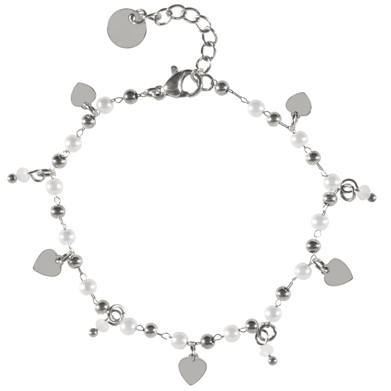 Bracelet composé d'une chaîne avec boules et pampilles cœurs en acier argenté, de perles d'imitation et de pampilles perles.