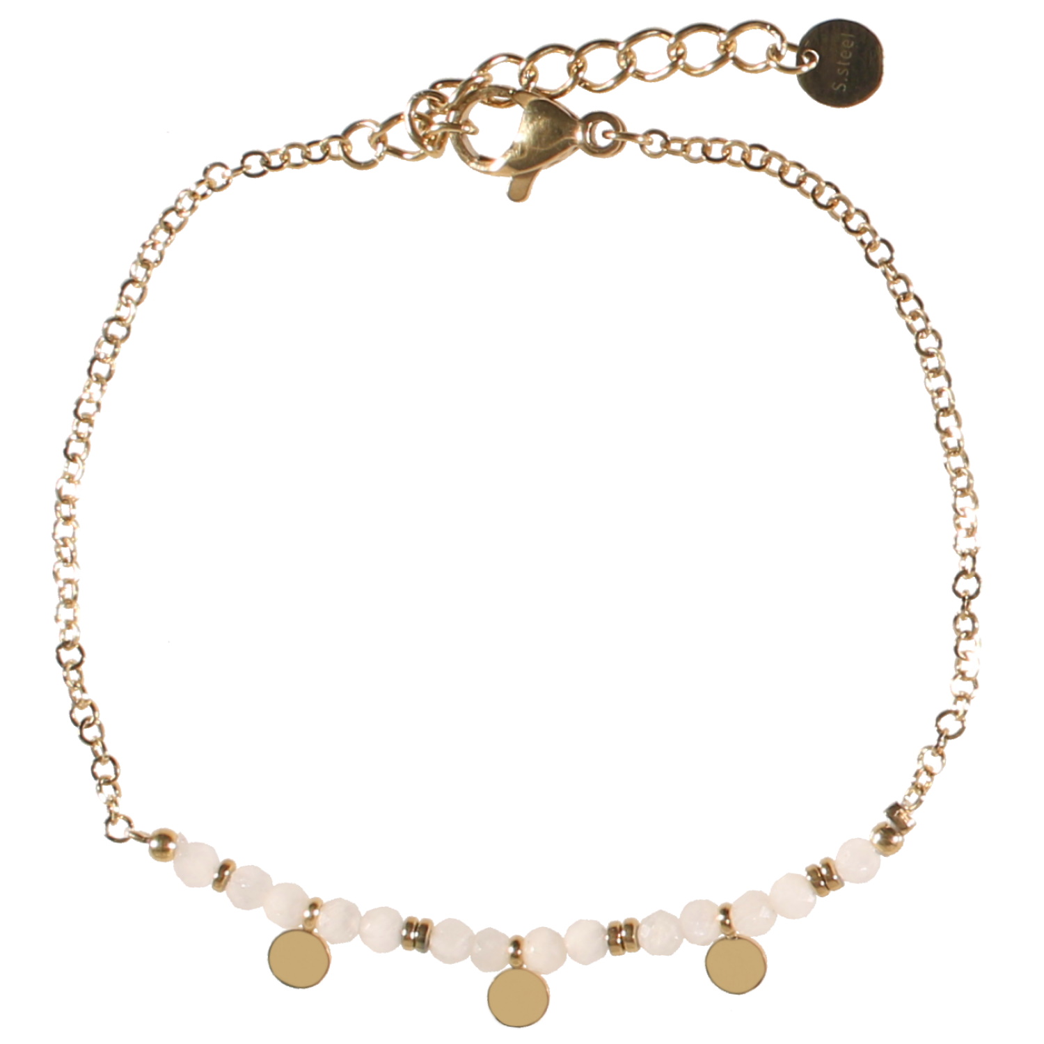 Description Bracelet composé d'une chaîne avec trois pampilles rondes en acier doré et de perles de couleur blanche. Fermoir mousqueton avec 3 cm de rallonge. Cliquez sur une matière, un thème, une couleur ou une collection pour voir tous les articles associés.