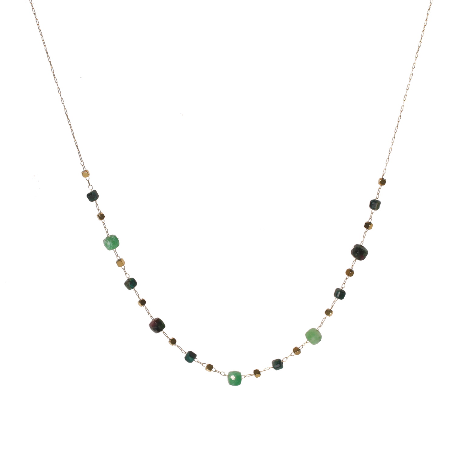 Description Collier composé d'une chaîne avec perles cubiques en acier doré et de perles cubiques de couleur verte. Fermoir mousqueton avec 5 cm de rallonge.