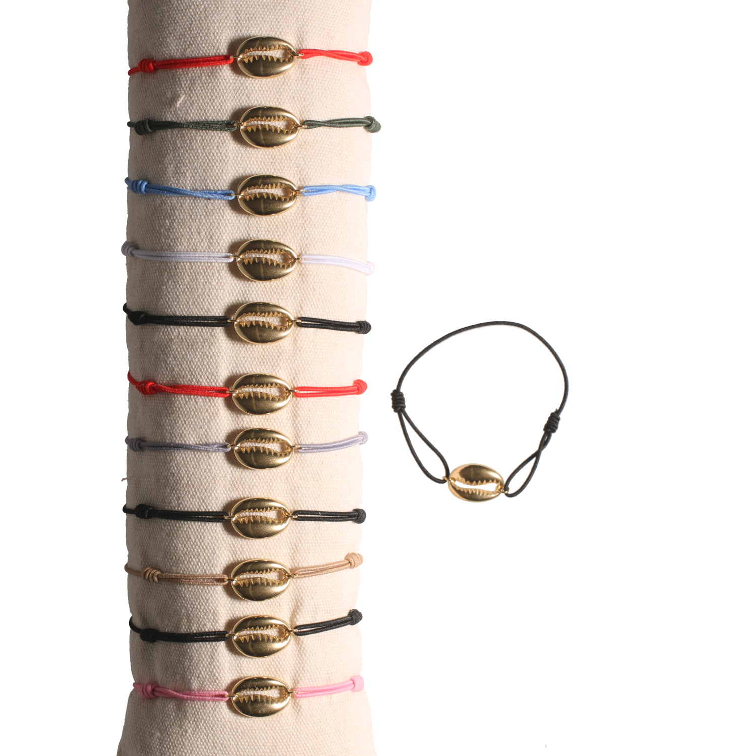 Bracelet fantaisie composé d'un cordon élastique en coton de couleur et d'un coquillage cauri en acier doré.