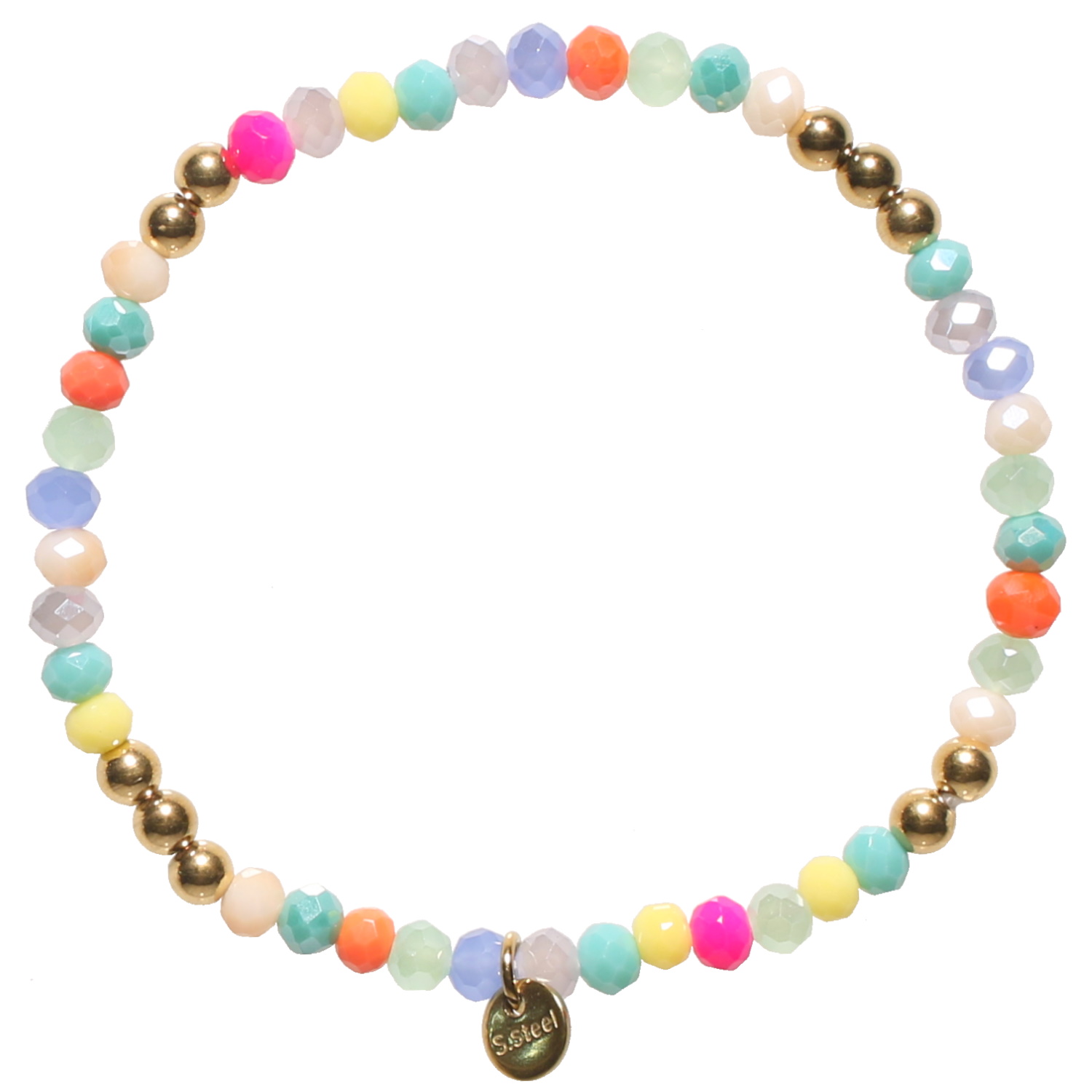 Bracelet fantaisie élastique composé de perles en acier doré et de perles multicolores.