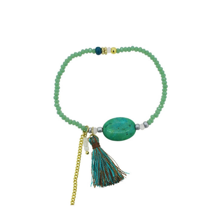 Bracelet fantaisie en métal doré, textile, rocaille, verre et pierre naturelle.