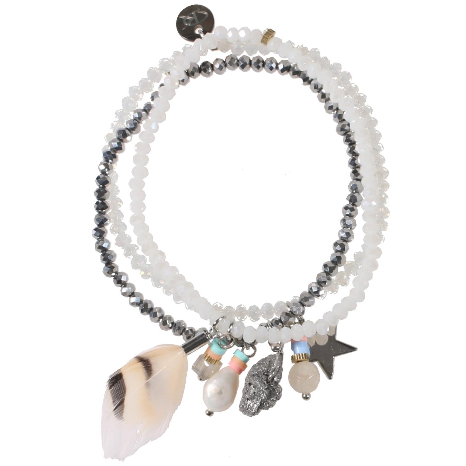 Lot de 3 bracelets fantaisie en métal argenté, métal doré, rocaille, pierre naturelle et plume. Elastique Etoile Plume  Adolescent Adulte Eté Femme Fille